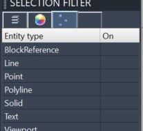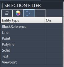 Controls the Selection Filter panel. It displays all entities in the drawing and allows you to filter and select entities by Layer, Color, entity Type and Linetype.