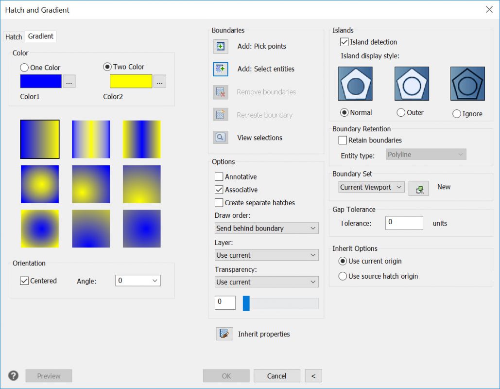Gradients can be displayed and created through a user-friendly interface. Improved Hatch Form.