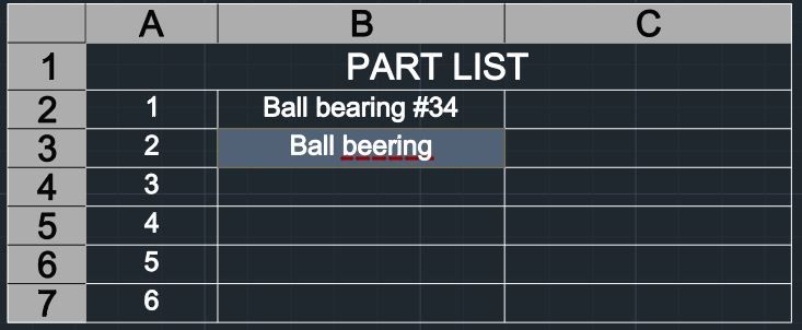 Multiline text, Multileader and Tables text is automatically checked for spelling while typing, underlining wrong words.